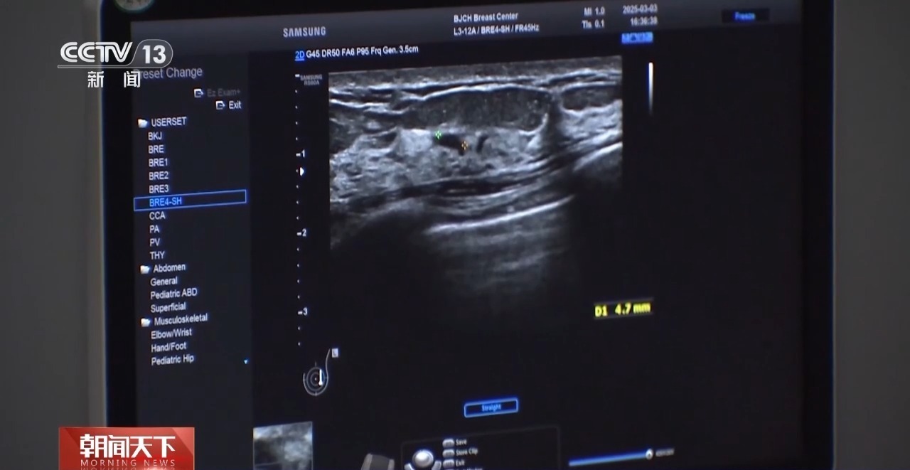 北京大学肿瘤医院乳腺癌预防治疗中心副主任医师霍苓:(超声检查)首先是没有辐射,然后安全性好,所以不同年龄阶段的女性,年轻女性孕妇,还有需要频繁检查的女性都是可以经常做的。钼靶是一个X线检查,它是有辐射的,做的时候会把病人的乳房整个夹成一个片状,所以病人的耐受程度也会差一点。